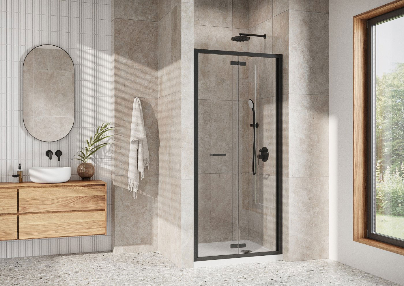 The fully framed Bi-Fold Door Shower Enclosure which opens inwards with 180 degrees pivoting action – a perfect space saving solution.