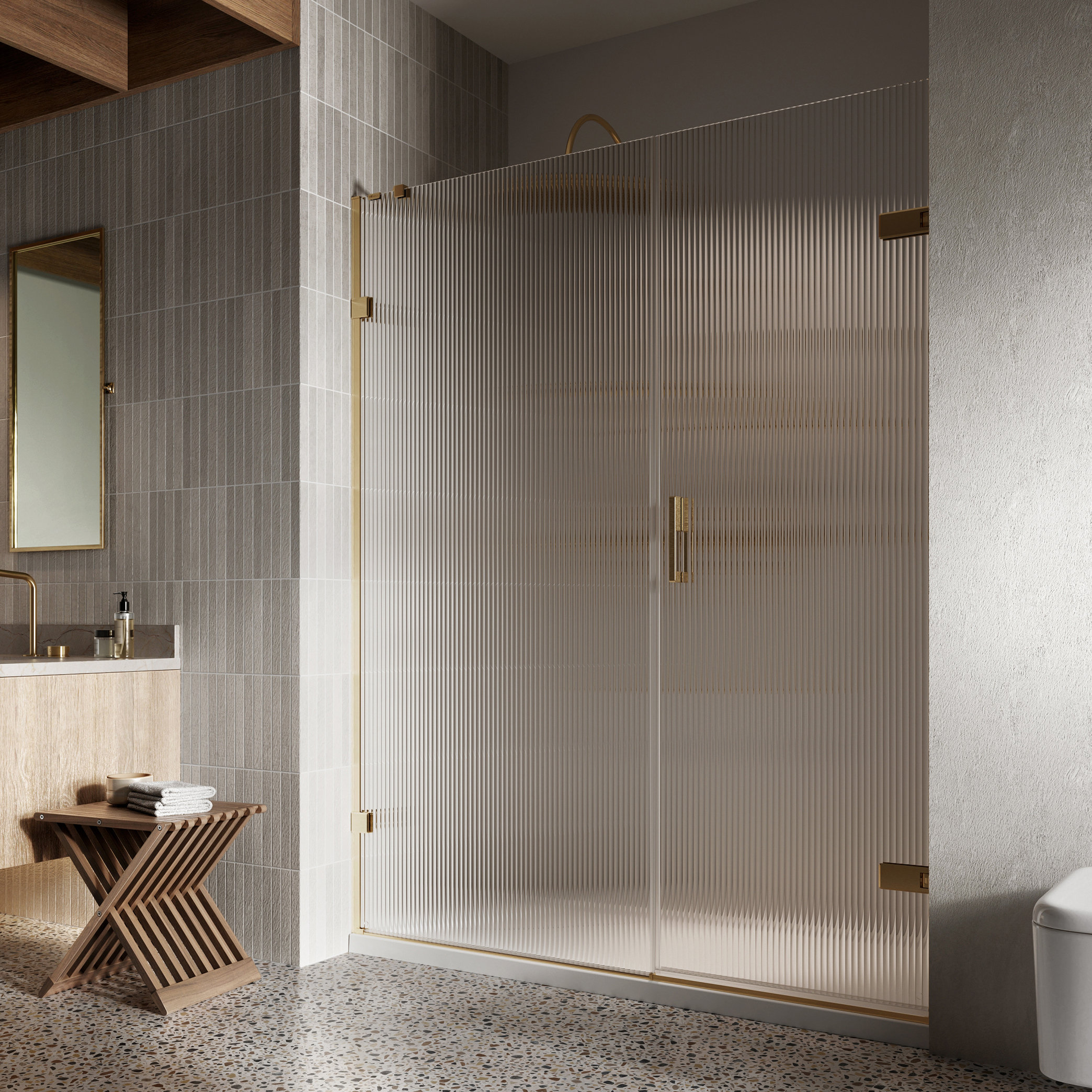 The Liberty Hinged Door with in-line panel in fluted glass creates an opulent sophisticated statement in the bathroom, freed from the shackles of traditional bathroom design, with its ultra-modern and exquisite glass finish.