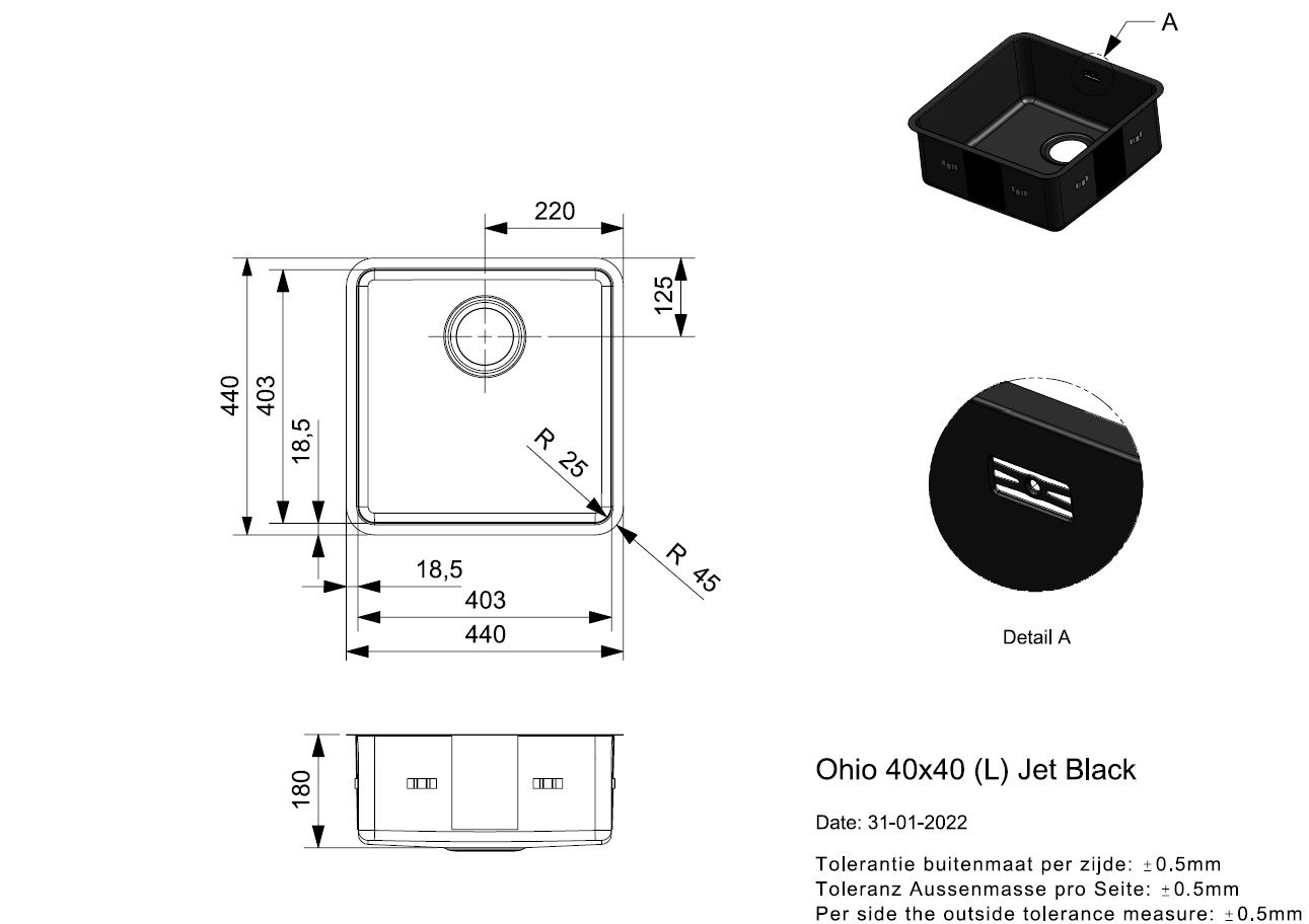 - Sink dimensions (mm): 403x403x180